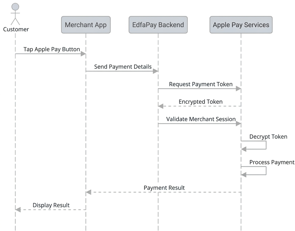 | 5 | EdfaPay | EdfaPay validates the merchant session with Apple, decrypts the token, and processes the payment |