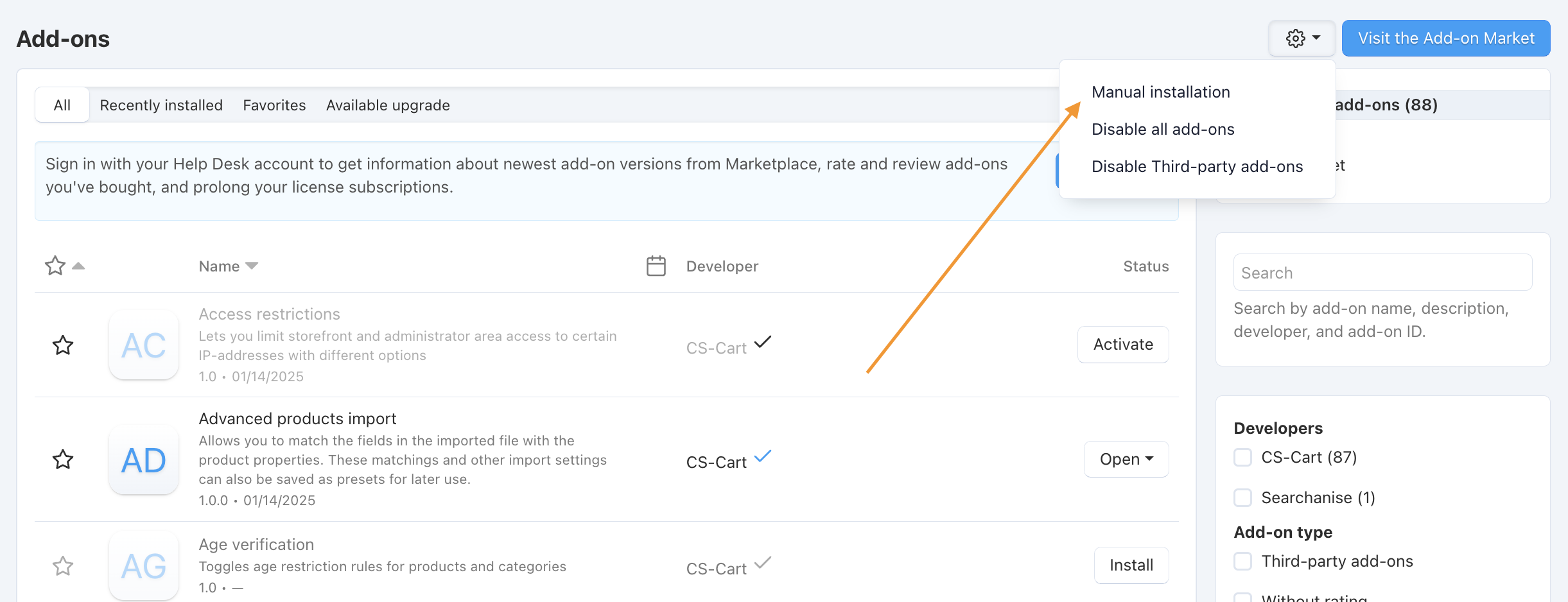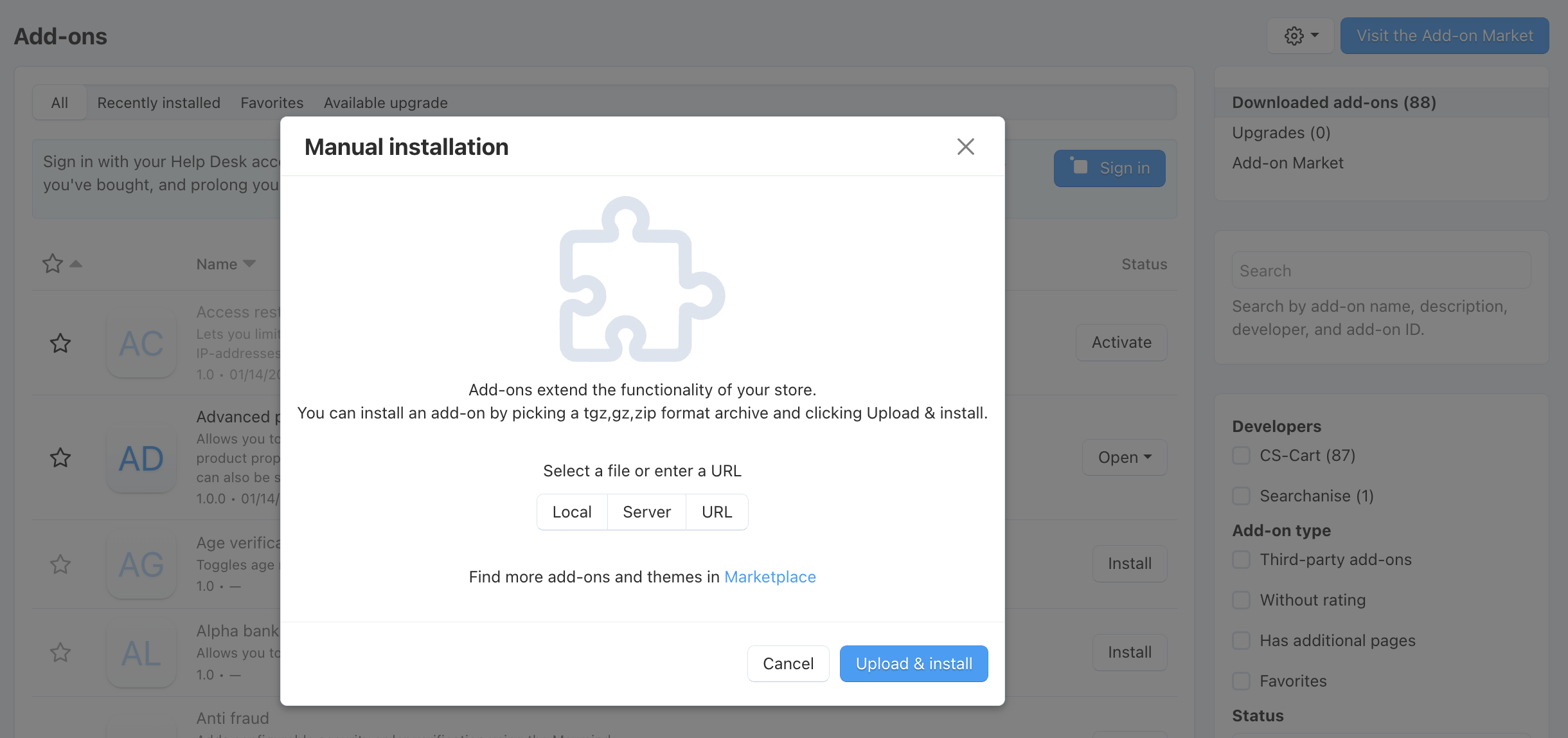 Navigate to Add-ons In your CS-Cart Admin Panel go to: Add-ons > Manage add-ons > Manual installation