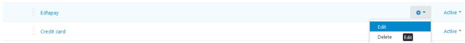 Set Up Payment Method Go to: Administration > Payment methods Select EdfaPay and click Edit.