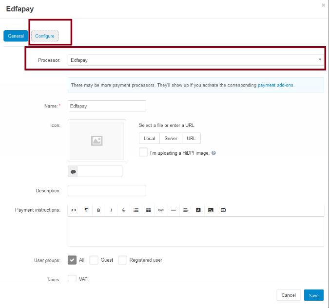 Configure Processor Set the processor to EdfaPay, then go to the Configuration tab.