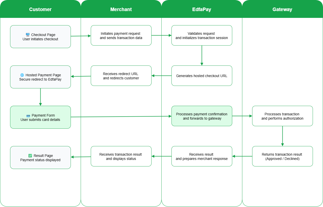 Best for quick setup. Redirect your customers to a secure hosted payment page managed by EdfaPay.