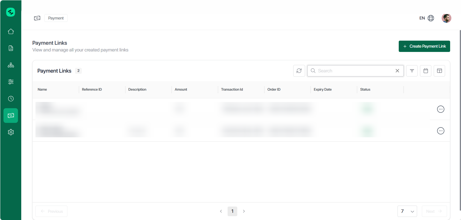 The Payment Links page displays all links created by the merchant and provides full visibility into their status and usage.