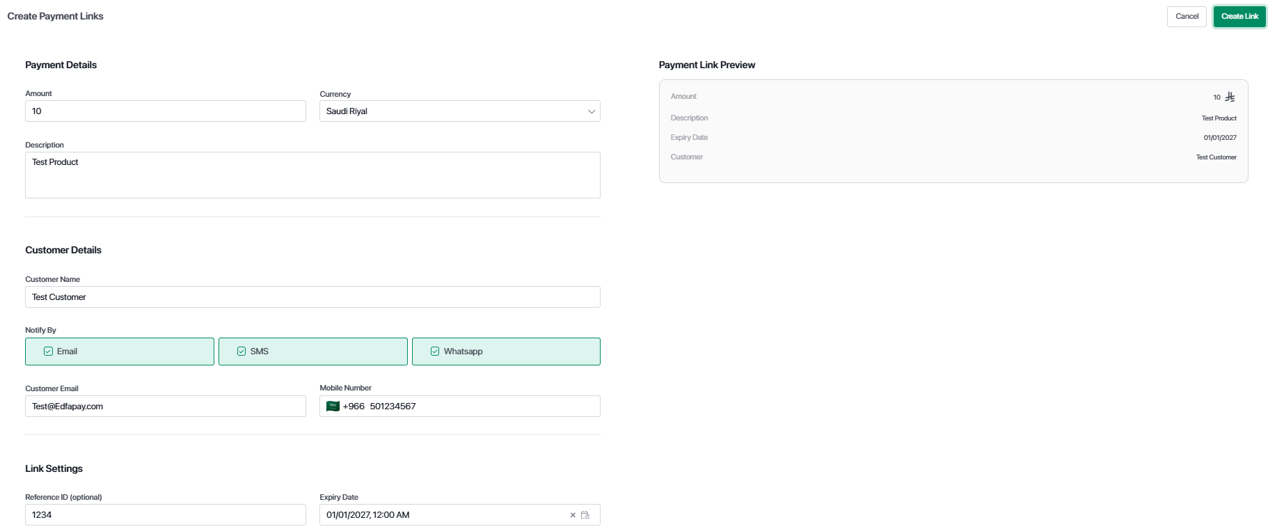 The Create Payment Link page allows merchants to generate a new payment link by entering payment and customer details.