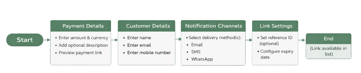 Once created, the link can be shared through email, SMS, or WhatsApp, enabling a seamless remote payment experience.
