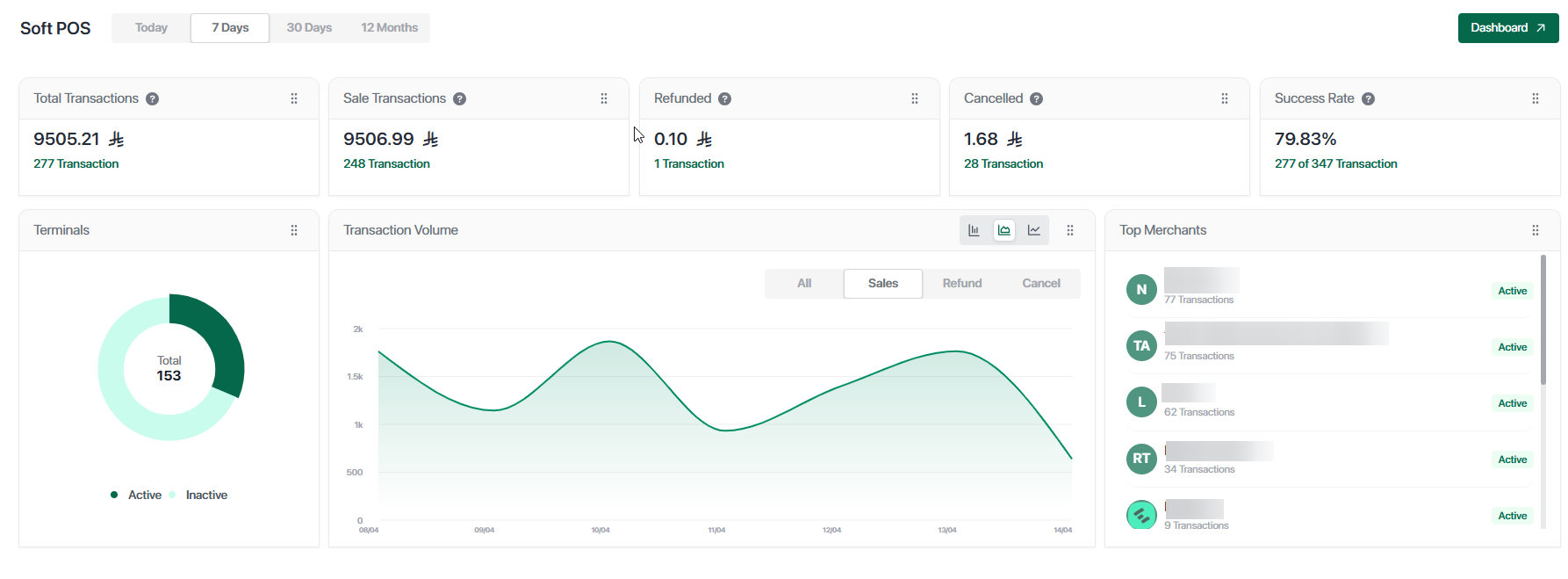 The dashboard presents key financial metrics such as total revenue, purchases, refunds, and reversals, along with the number of transactions for each category. It also includes terminal insights showing registered and unregistered devices, as well as charts that visualize transaction trends over time.