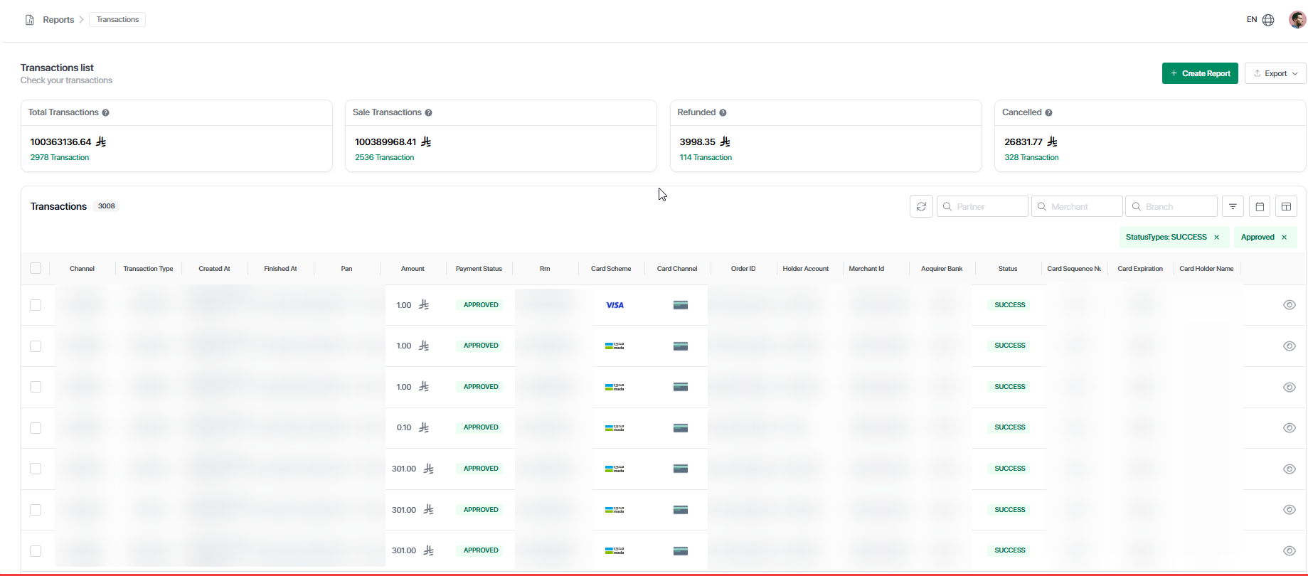 From this page, users can review report history, download reports again, and track the status of generated reports. All reports are based on the filters applied in the Transactions page, ensuring consistency between viewed data and exported data.